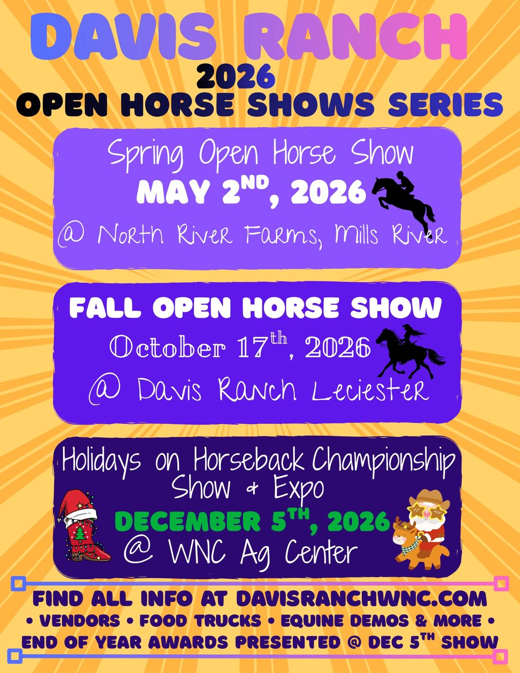 We're very excited to host our Fourth Spring Open Horse Show at North River Farms (3333 N. Mills River Rd, Mills River) on Saturday, May 2nd...